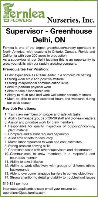 Jul 29, 2021 (Expired). Fernlea Nurseries, Inc. Jobs Ads from The Norfolk and Tillsonburg News