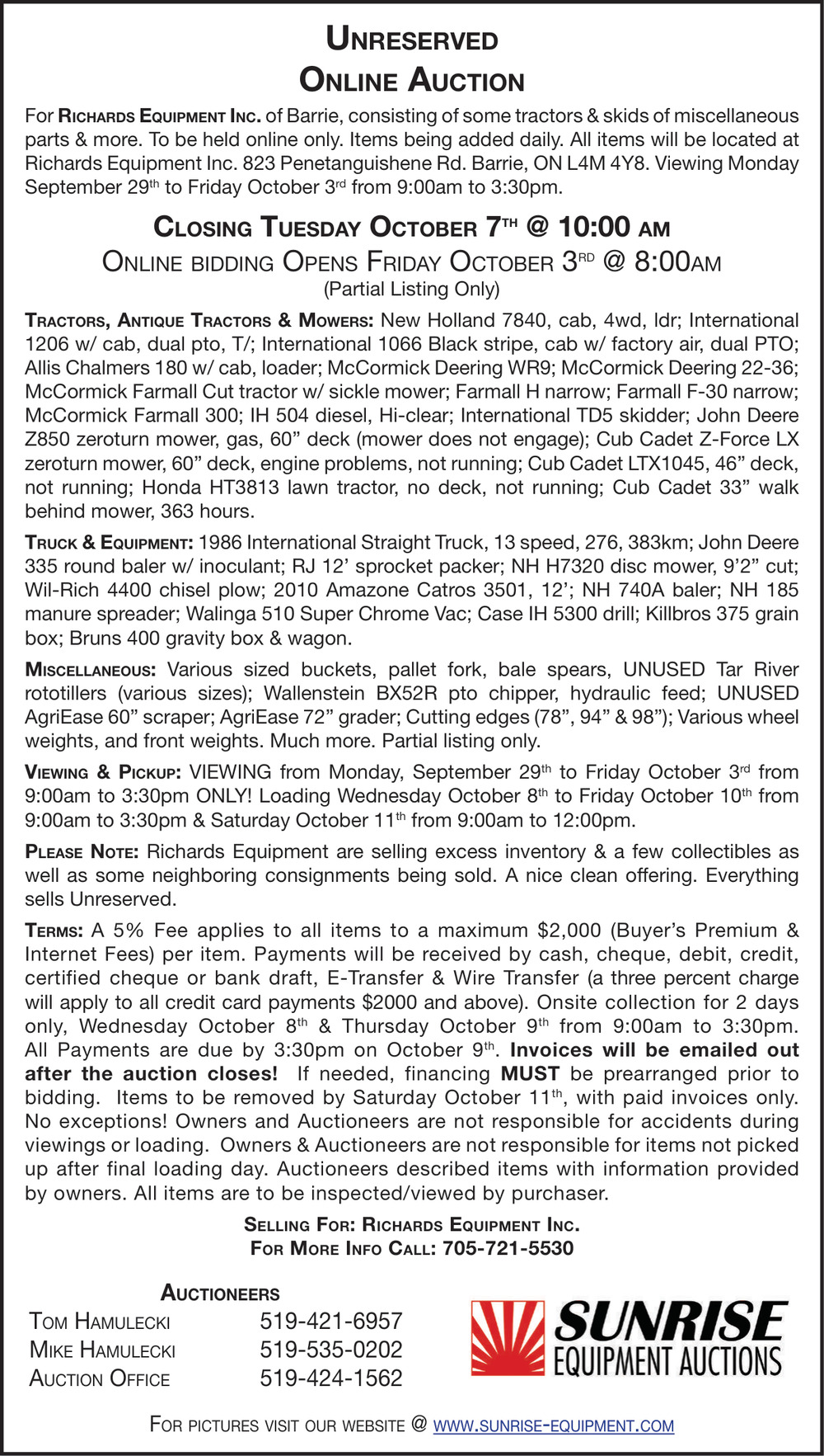 Oct 02, 2025. Sunrise Equipment Auctions Inc. Auctions Ads from The Norfolk and Tillsonburg News
