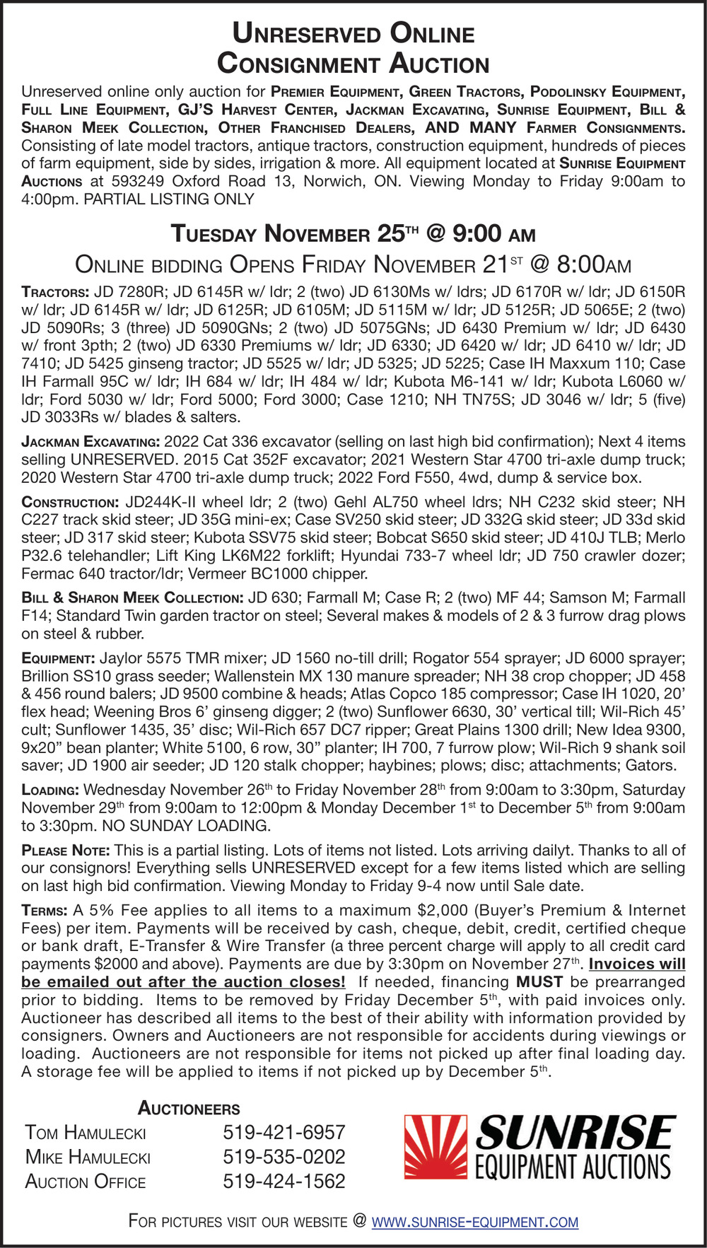 Nov 13, 2025. Sunrise Equipment Auctions Inc. Auctions Ads from The Norfolk and Tillsonburg News