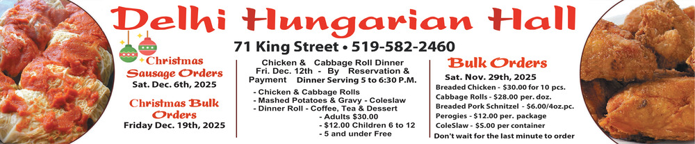 Nov 20, 2025. Delhi Hungarian Hall Restaurant Ads from The Norfolk and Tillsonburg News