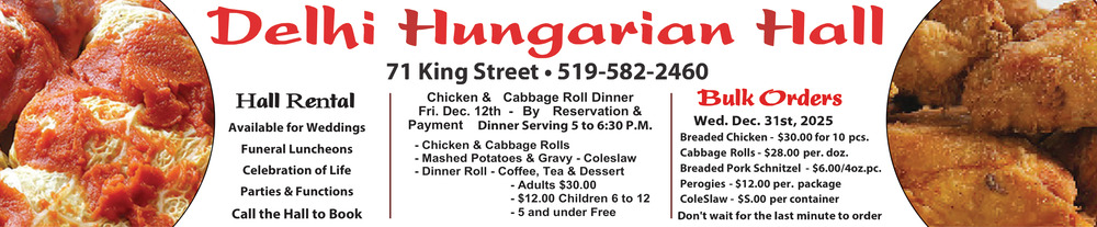 Dec 04, 2025. Delhi Hungarian Hall Restaurant Ads from The Norfolk and Tillsonburg News