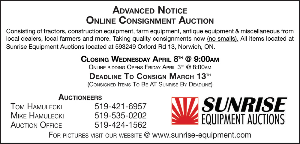 Feb 19, 2026. Sunrise Equipment Auctions Inc. Auctions Ads from The Norfolk and Tillsonburg News