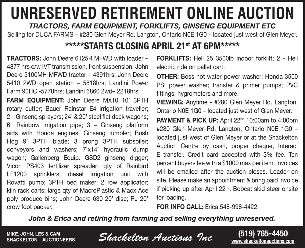 Apr 09, 2026. Shackelton Auctions Inc Auctions Ads from The Norfolk and Tillsonburg News