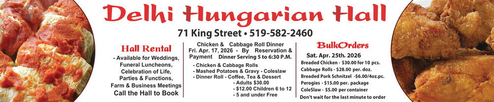 Apr 09, 2026. Delhi Hungarian Hall Restaurant Ads from The Norfolk and Tillsonburg News