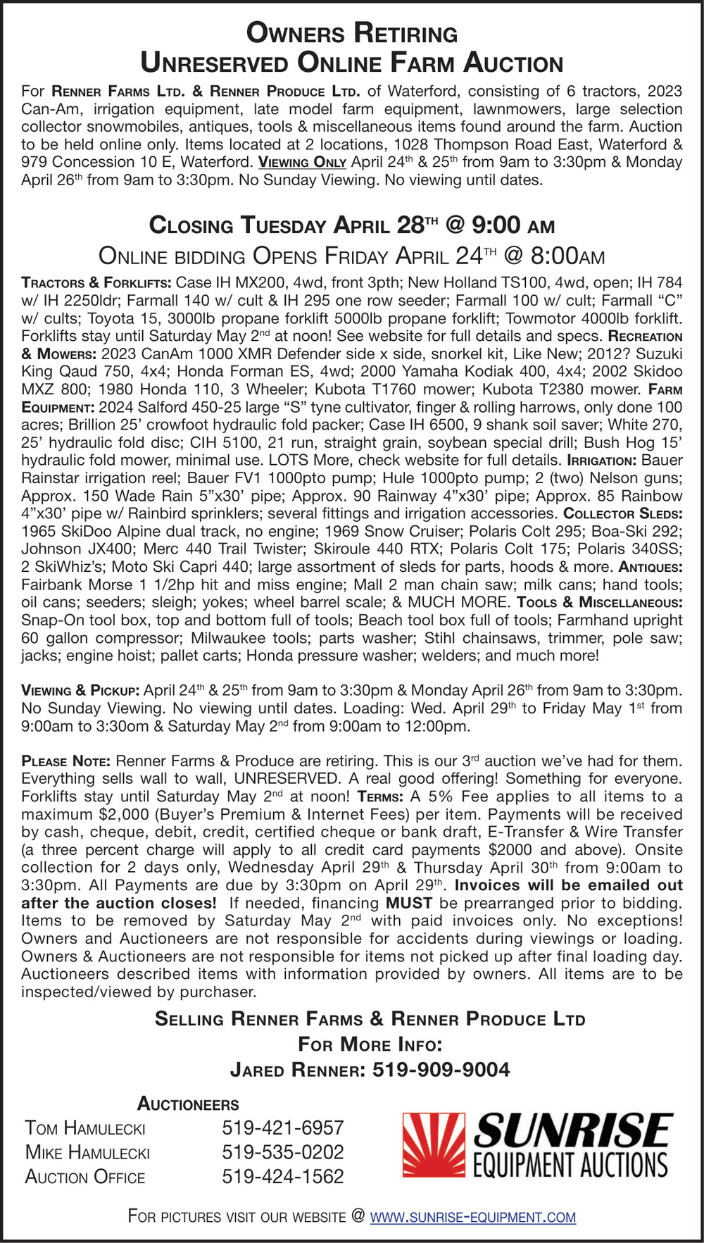 Apr 23, 2026. Sunrise Equipment Auctions Inc. Auctions Ads from The Norfolk and Tillsonburg News